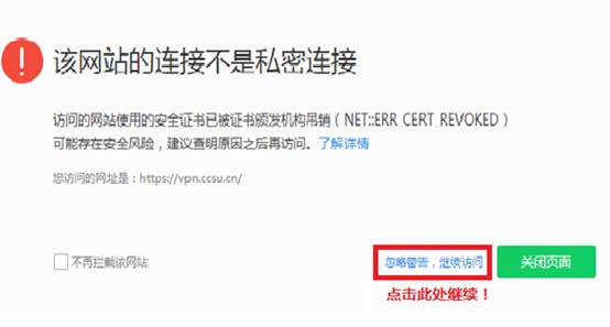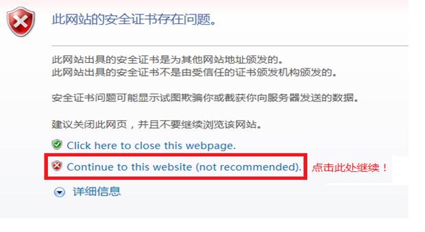 2、按Enter(回车键),出现如下图所示的界面,点击“继续浏览网站”(或点击“忽略警告,继续访问”等,不同的浏览器界面可能稍有不同)。
