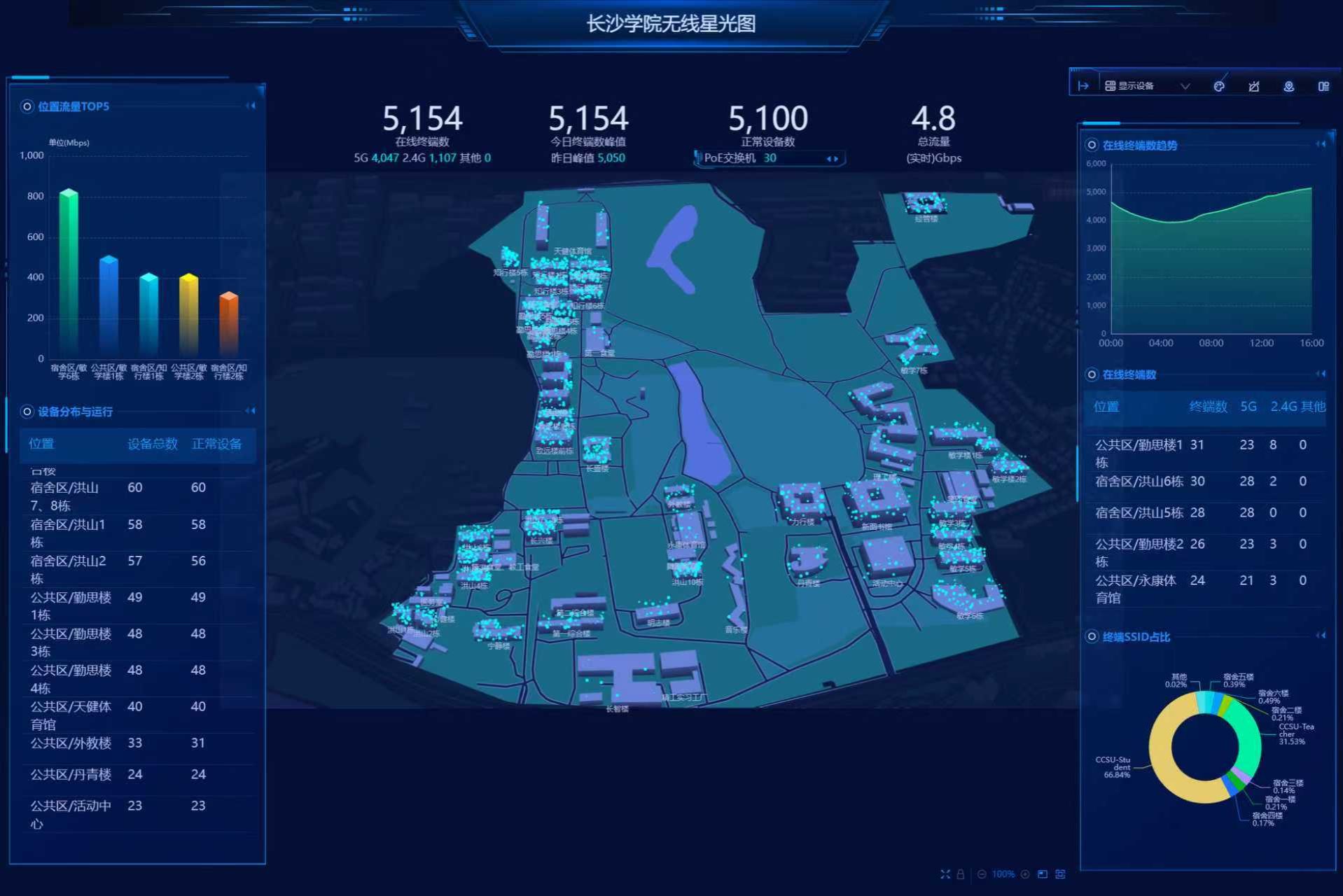 我校于2023年7月正式启动校园网有线无线一体化建设项目,截至 2025年9月,已累计完成22栋办公教学楼宇、4个学生宿舍园区、6个公共场馆的无线全覆盖,同时实现校园网统一认证、无缝漫游、多业务承载、扁平化管理、认证安全等核心功能,完成底层网络架构与管理模式全面升级。