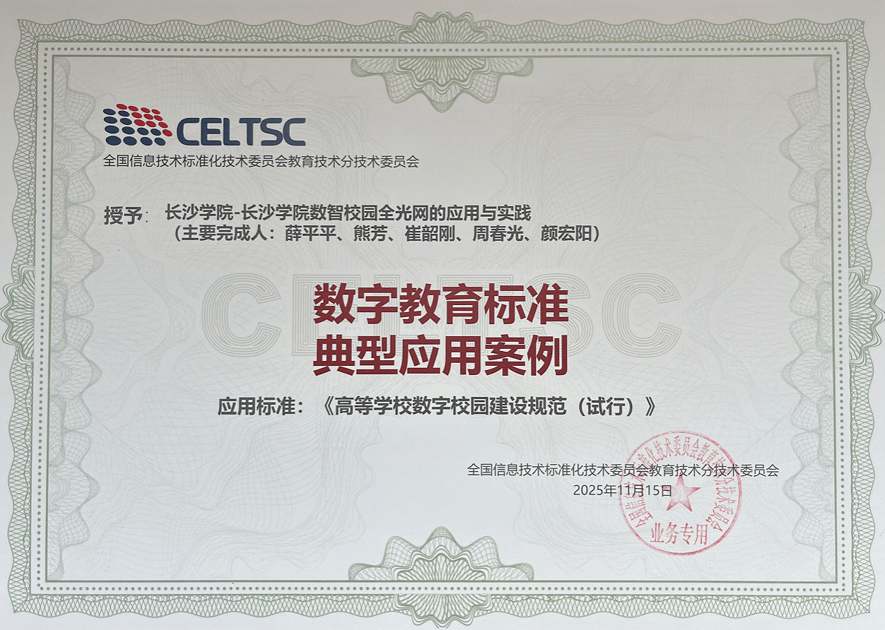 近日,从全国信息技术标准化技术委员会教育分技术委员会(CELTSC)传来喜讯,我校报送的《长沙学院数智校园全光网的应用与实践》案例,在 2025年CELTSC标准创新与应用案例评选活动中获评典型应用案例,这标志着我校在数智校园建设领域的实践成果获得全国教育信息化领域权威机构的认可。