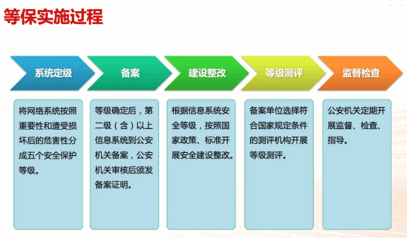 根据网络安全等级保护相关标准,等级保护工作总共分五个阶段,分别为:系统定级、系统备案、系统安全建设、系统等级测评、监管单位定期监督检查。